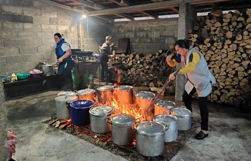 No domingo, a atenção voltou-se para o desmanche do animal e a preparação de refeições para mais de cem pessoas. Entre os pratos confeccionados estiveram rojões, arroz de sarrabulho, belouras, sopa da matança e aletria, todos preparados ao redor da fogueira que marcou o ponto alto do convívio.