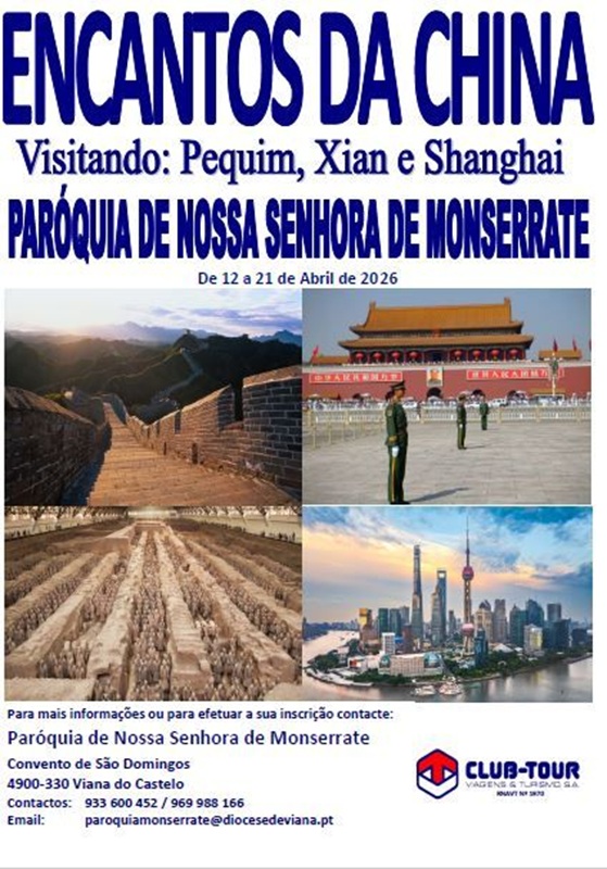 A Paróquia de Nossa Senhora de Monserrate, em Viana do Castelo, vai organizar, de 12 a 21 de abril de 2026, uma viagem cultural sob o mote “Encantos da China”. O itinerário inclui visitas a três das mais importantes cidades chinesas: Pequim, Xian e Shanghai.